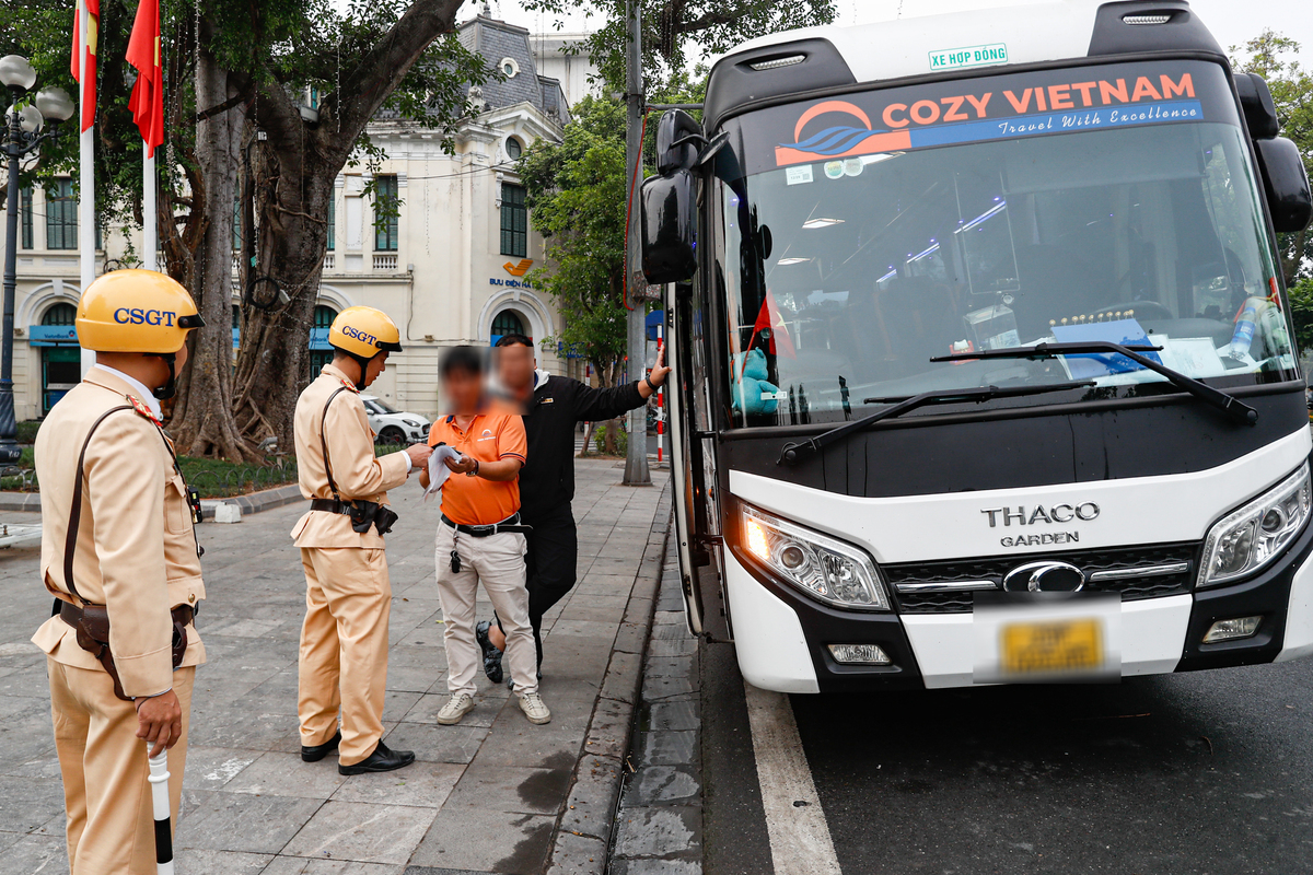 Tài xế vi phạm bị CSGT lập biên bản xử phạt và tuyên truyền về quy định hạn chế xe khách trên 16 chỗ hoạt động trong phố cổ và quanh Hồ Hoàn Kiếm trong giờ cao điểm.