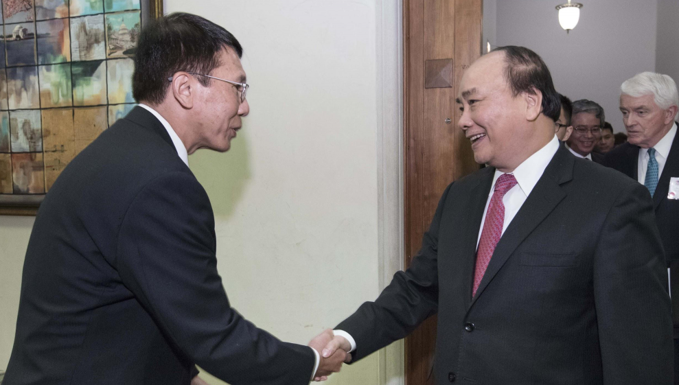 Giám đốc Công nghệ Uber toàn cầu Thuận Phạm (trái) bắt tay Thủ tướng Nguyễn Xuân Phúc