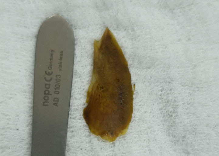 Ngày 4/1, các bác sĩ đã phẫu thuật nội soi ổ bụng cho người bệnh và phát hiện có một lỗ thủng ruột non ở cách góc hồi manh tràng 20cm. Mở tổn thương kiểm tra, bác sĩ thấy một dị vật giống mang cá đâm thủng thành ruột từ trong ra ngoài, xung quanh lỗ thủng ruột được bao phủ nhiều giả mạc và dịch đục. Kíp phẫu thuật đã lấy mảnh xương ra và khâu lại lỗ thủng ruột, rửa sạch bụng và đặt dẫn lưu vùng mổ.