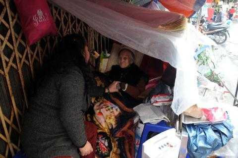 Các con cụ buộc phải dùng nilon, vải bạt để quấn quanh vỉa hè che gió mưa cho cụ, để cụ Cúc nằm trên một chiếc giường gấp và giữ ấm cho cụ bằng nhiều chiếc chăn quấn xung quanh người.