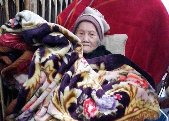 | Cụ bà Nguyễn Thị Cúc 95 tuổi đang chịu rét trên vỉa hè. |