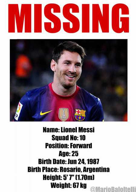Một tài khoản trên trang Twitter đã giả danh Balotelli với lời nhắn: "Lionel Messi đã mất tích. Lần cuối cùng người ta thấy anh là ở trận đấu với Milan tại sân San Siro. Nếu có thông tin, hãy báo cho cảnh sát." |