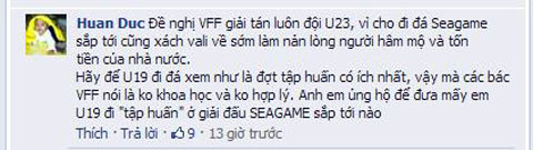 Trên facebook của CLB bóng đá HAGL Arsenal JMG, độc giả Huan Duc không giấu được sự búc xúc khi nói thẳng: "Đề nghị VFF giải tán luôn đội U23, vì cho đi đá SEA Games sắp tới cũng xách vali về sớm làm nản lòng người hâm mộ và tốn tiền của nhà nước. Hãy để U19 đi đá xem như là đợt tập huấn có ích nhất, vậy mà các bác VFF nói là ko khoa học và ko hợp lý. Anh em ủng hộ để đưa mấy em U19 đi "tập huấn" ở giải đấu SEA Games sắp tới nào".