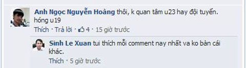 Đồng tình với quan điểm trên, độc giả Anh Ngọc Nguyễn Hoàng chua chát: " Thôi, không quan tâm U23 hay đội tuyển. Hóng U19".