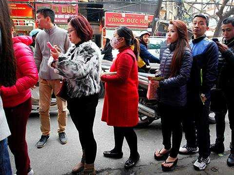 Chính vì thế, ngay từ 5 giờ sáng đã có rất nhiều người đứng xếp hàng trước một cửa hàng vàng trên đường Cầu Giấy để mua vàng may mắn ngày Vía Thần Tài.
