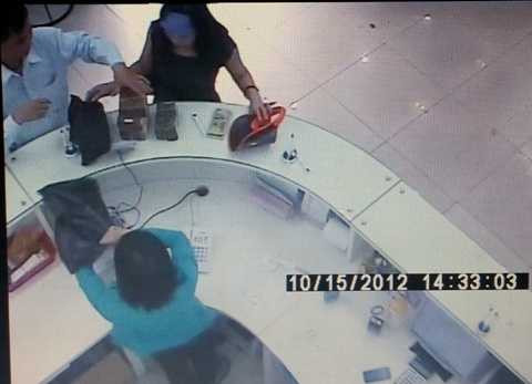 | Chị V. và Thắng đi rút tiền. (Ảnh chụp lại từ camera ngân hàng) |