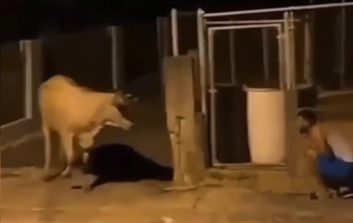 Đang thong dong đi bộ thì bị ông chủ ở góc khuất nhảy ra doạ, chú bò giật bắn mình ngã lăn quay với tư thế rất buồn cười.
