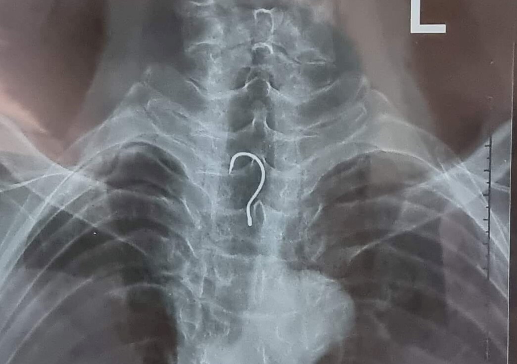 Ông A. được người thân đưa vào Bệnh viện Đa khoa tỉnh Hà Tĩnh thăm khám sau nhiều ngày ăn uống khó khăn. Các bác sĩ phát hiện một chiếc lưỡi câu có chiều dài gần 4cm, vòng cung rộng gần 1,5cm, nằm trong thực quản của bệnh nhân.
