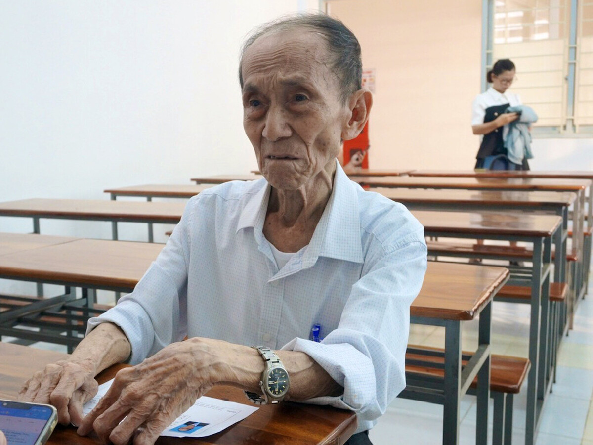 Ông Nguyễn Tấn Thành (87 tuổi, ngụ quận Ninh Kiều) trong buổi thi đánh giá năng lực ngoại ngữ đầu vào trình độ cao học sáng ngày 25/5. (Ảnh: H.T)