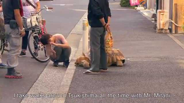 Cụ ông dắt rùa khổng lồ đi dạo gây xôn xao đường phố