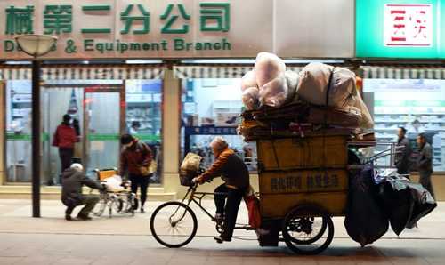 | Một người đàn ông đang đạp xe qua một khu phố mua sắm tại Bắc Kinh. Ảnh: Bloomberg |