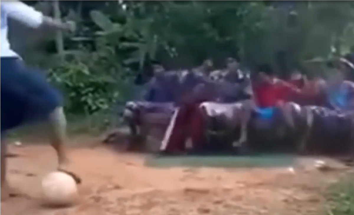 Chàng thanh niên vừa tung chân sút, cả đoàn người đang ngồi xếp hàng ngay ngắn bỗng ngã lăn ra đất.