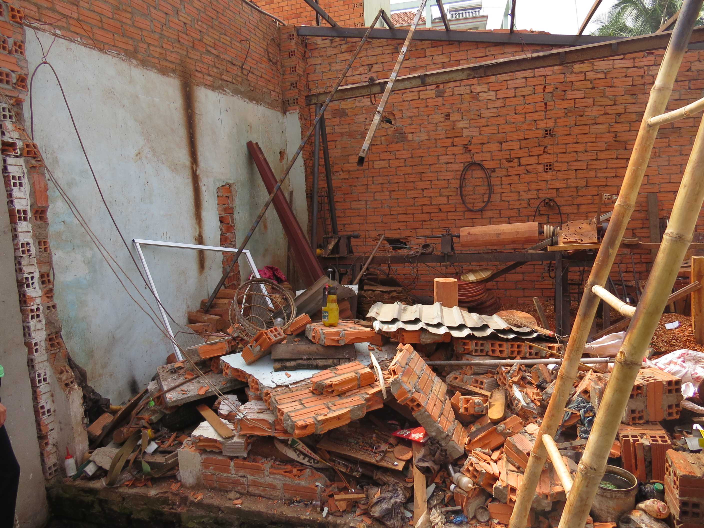 Không may, quả đạn phát nổ. Cú nổ long trời khiến xưởng mộc của anh Đức bị sập tường, tung mái tôn; nhiều mảnh đạn văng tung tóe làm hư hại đồ đạc cùng cửa kính của 4 hộ dân xung quanh.