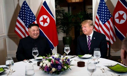 Tổng thống Mỹ Trump và Chủ tịch Triều Tiên Kim Jong-un trong bữa tối 27/2 tại Hà Nội. Ảnh: NYT