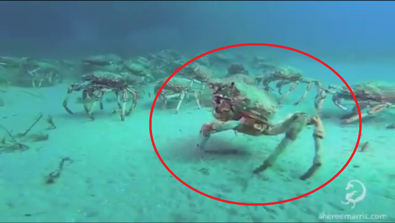 Đoạn video ghi lại cảnh tượng khá thú vị về đàn cua nhện Nhật Bản di chuyển dưới lòng đại dương, đáng chú ý là hình ảnh chú cua chỉ có 3 chân đang bước từng bước vô cùng khó nhọc.