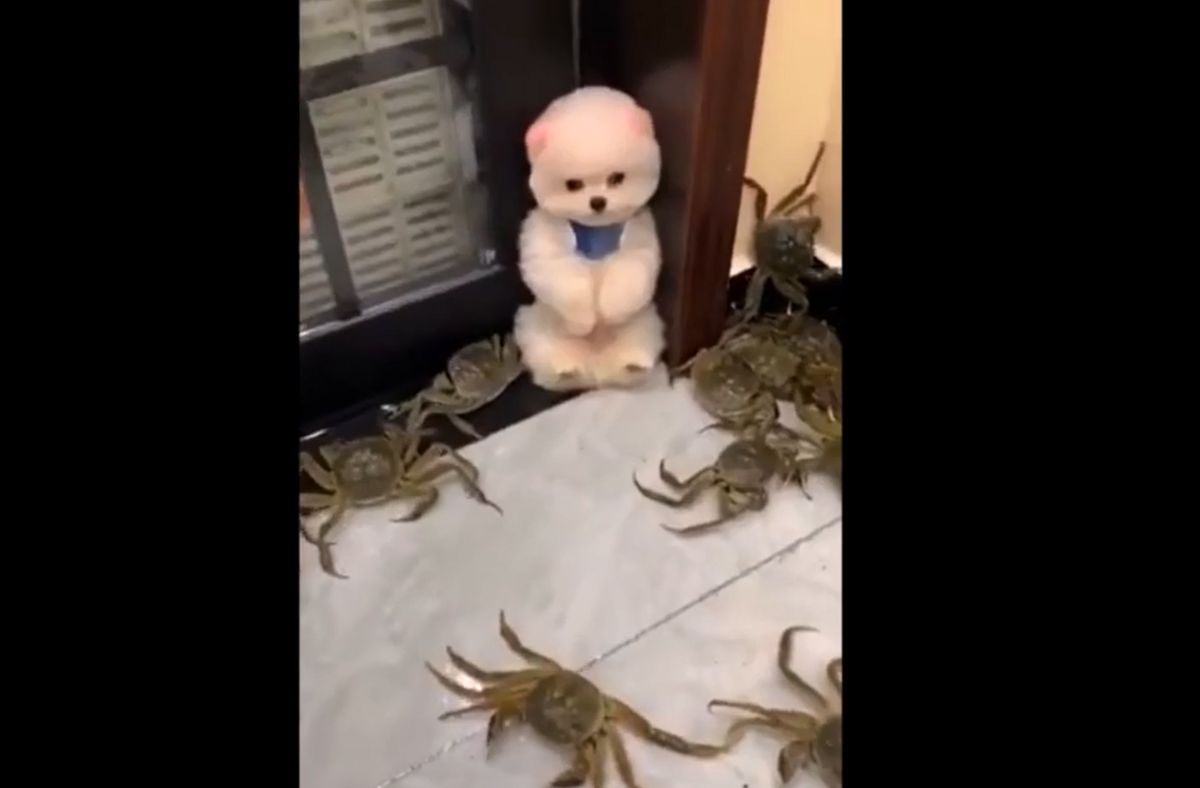 Trước sự tấn công của đàn cua, chú chó nhỏ xinh xắn sợ hãi nép vào ó nhà, chờ chủ đến cứu.