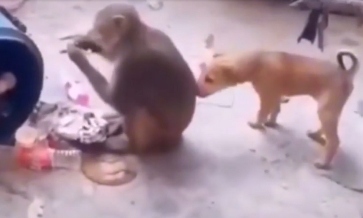 Đang ăn thì bị làm phiền, khỉ tức giận nắm đầu cún con đánh túi bụi để cảnh cáo.
