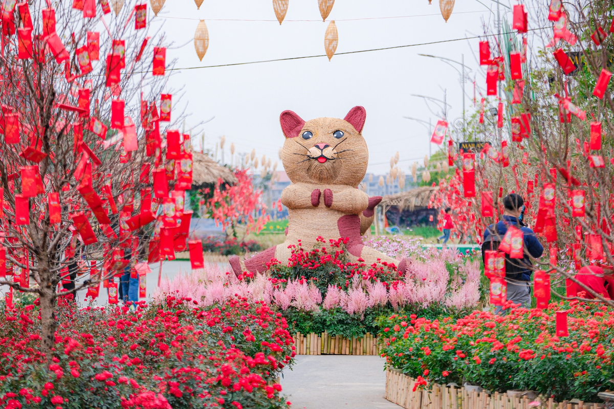 Trong đó, điểm nhấn là 3 linh vật mèo An nhiên, Hạnh phúc, Sức khỏe do các nghệ nhân tết từ thân cây lục bình phơi khô, đặt ở vị trí trung tâm đường hoa.