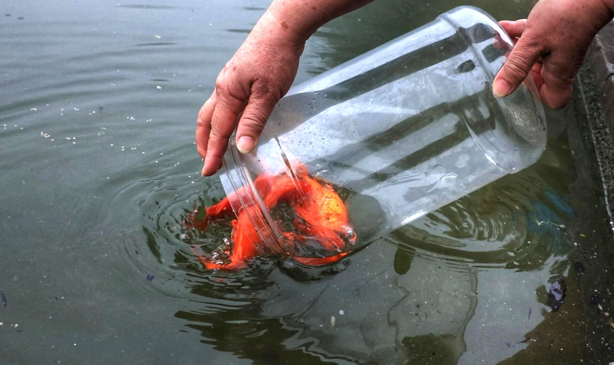 Khi phóng sinh nên thả cá từ từ xuống nước. (Ảnh: Đắc Huy)