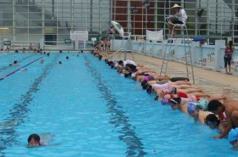 | Các Huấn luận viên đang hướng dẫn học viên tham gia học bơi tại Cung Thể thao dưới nước. |