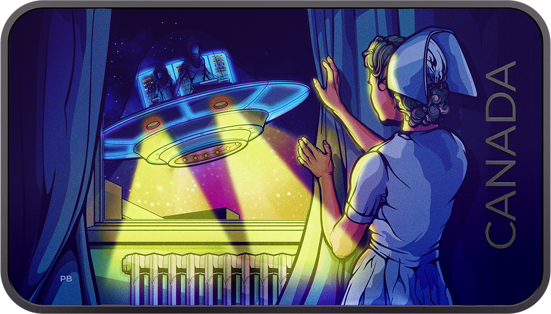 Đồng xu này do nghệ sĩ đảo Gabriola, Patrick Bélanger trực tiếp thiết kế. Bélanger thực sự ấn tượng từ câu chuyện gặp gỡ UFO này. Anh ấy nói: “Căn phòng bệnh viện buồn tẻ tương phản với ánh đèn rực rỡ của UFO bên ngoài cửa sổ, nó mang lại cho đồng xu sưu tầm cảm giác bí ẩn”.