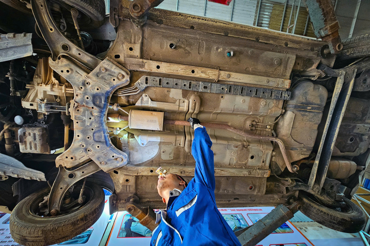 Bùn đất, rác thải bám chặt vào gầm, hệ thống treo và ống xả. Công việc của thợ sửa chữa dưới gầm xe không chỉ vất vả mà còn phải cẩn trọng với các chi tiết bị ăn mòn sau khi tiếp xúc lâu với nước lũ.