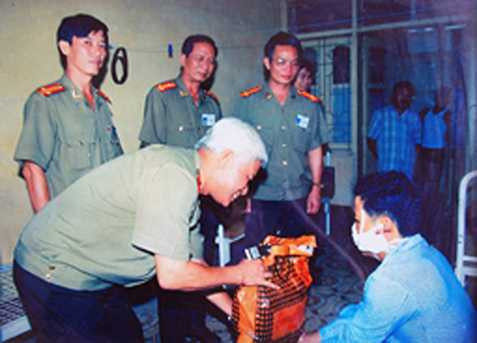 | Thứ trưởng Bộ Công an Nguyễn Văn Tính thăm hỏi đại úy Thân Đức Thuận. Ảnh tư liệu |