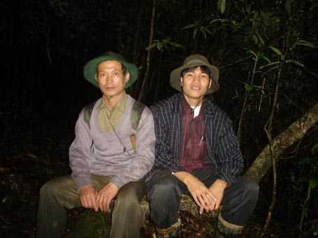 | Tác giả và "người rừng" Trần Ngọc Lâm lần đầu gặp mặt. Hình ảnh chụp dưới tán rừng rậm như cảnh đêm. |