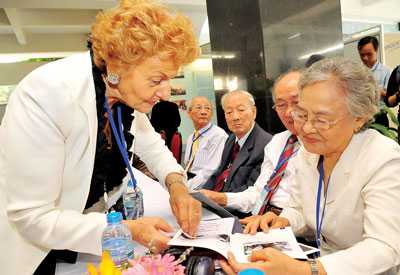 | Bà Hélène Luc, Chủ tịch danh dự Hội Hữu nghị Pháp-Việt trao đổi với các đại biểu tại buổi giao lưu. |