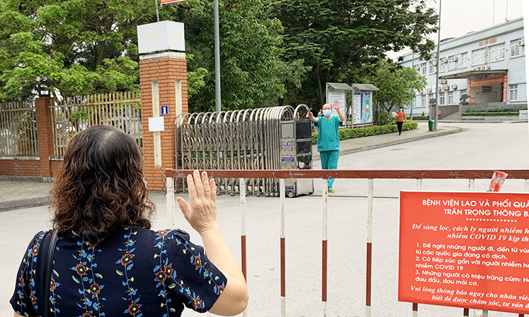 Bức ảnh được một đồng nghiệp của bác sĩ Hùng chụp, chia sẻ sáng 30/3, sau gần một tháng bác sĩ chưa về nhà. Chị đứng ngoài hàng rào, nói với vào trong.