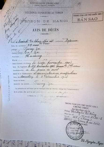 | Bản dịch Giấy báo tử của Phủ thống sứ Bắc Kỳ |