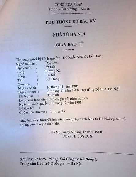 Theo “Báo cáo tổng hợp 7/1908” của E.Duvillier, quan công sứ tỉnh Hà Đông, có 13 người bị xử tử trong vụ Hà thành đầu độc. Trong số đó, có 2 người, gồm thầy giáo Đỗ Khắc Nhã, tức đồ Đàm và đầu bếp Nguyễn Văn Hiên, tức Hai Hiên.