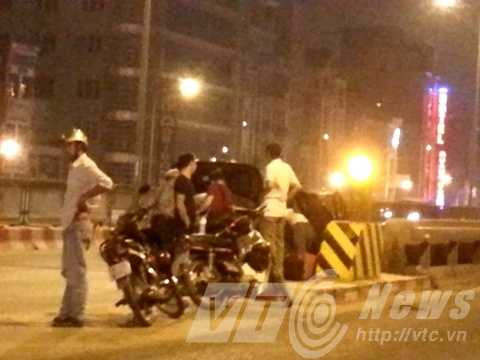 Không đỗ cùng vị trí với đám xe ôm, nhóm người này chủ yếu đứng sát thành đường trên cao để chờ xe. Mỗi lần có xe ô tô rẽ làn đi xuống, họ lại nhảy khỏi xe máy, co rúm vào thành đường để tránh.
