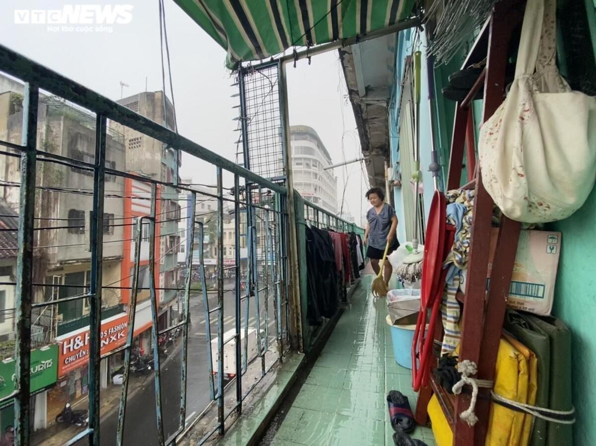 Bà Trân là một trong số 32 hộ dân đang sinh sống tại khu chung cư này. Dọn dẹp xong xuôi, bà trầm ngâm ngồi tựa cửa, hướng mắt nhìn ra phía ban công, phía dưới chân bà là con đường đắt đỏ bậc nhất Sài Gòn - đường Trần Hưng Đạo. Bà kể rằng, nhiều năm nay phải sống trong lo sợ vì chung cư trong tình trạng cảnh báo sập.