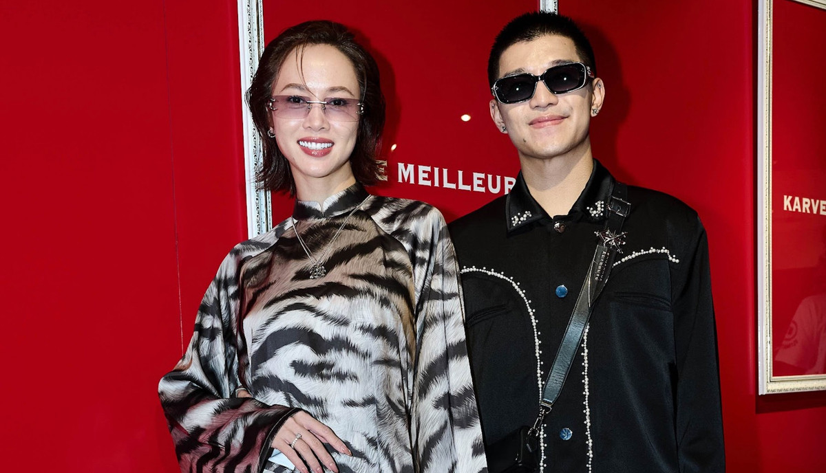 Đến chúc mừng người bạn thân thiết, Vũ Ngọc Anh chọn áo dài hoạ tiết ấn tượng có tên “Bạch Vân” trong bộ sưu tập “Thanh Uy”. Trong khi đó, Cường Seven mang đến tinh thần hiện đại pha lẫn cá tính với jacket thêu ánh kim cùng quần dáng thụng.
