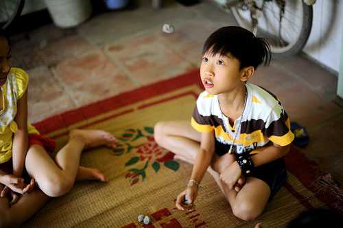 | Ngoài việc mê hát chèo, tuồng, quan họ... Đức Vĩnh cũng là đứa trẻ thích các trò chơi như đánh chắt, nhảy dây... |
