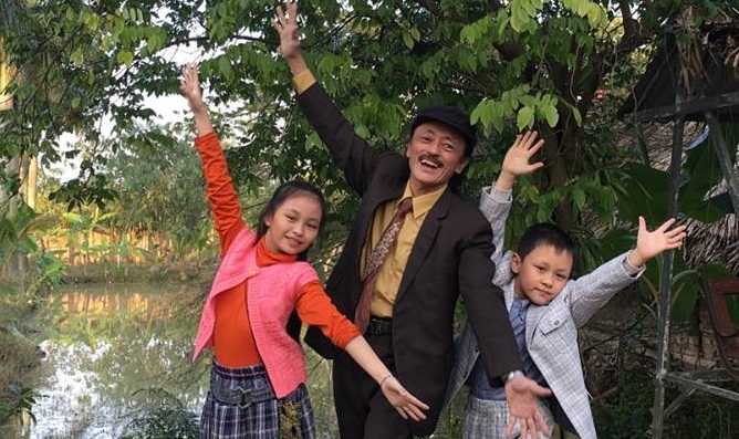 Giang còi rất yêu chiều các con. Vào những buổi chiều không phải đi diễn, anh thường đèo con trên xe máy đi dạo quanh ngôi làng nhỏ mà anh đang ở.