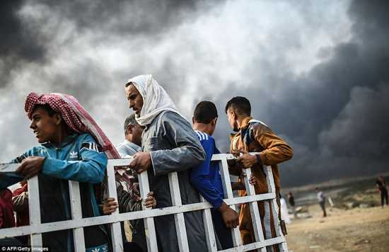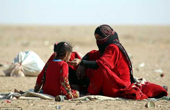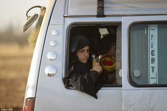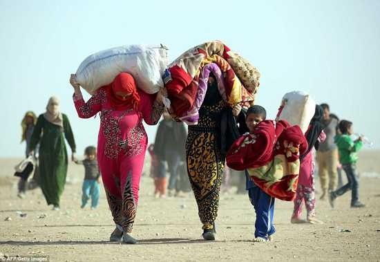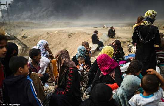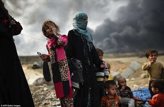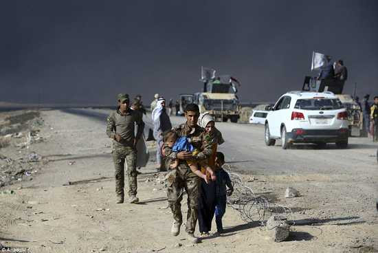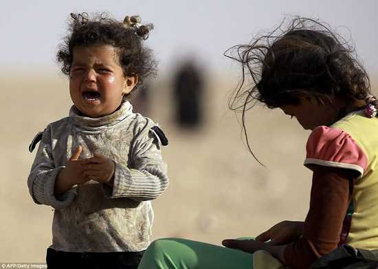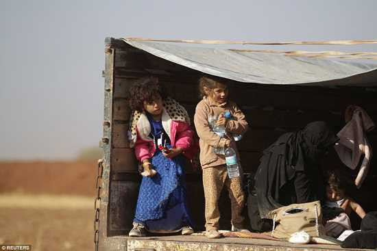 Những em bé cùng gia đình trên đường rời Mosul hướng về biên giới giáp Syria.