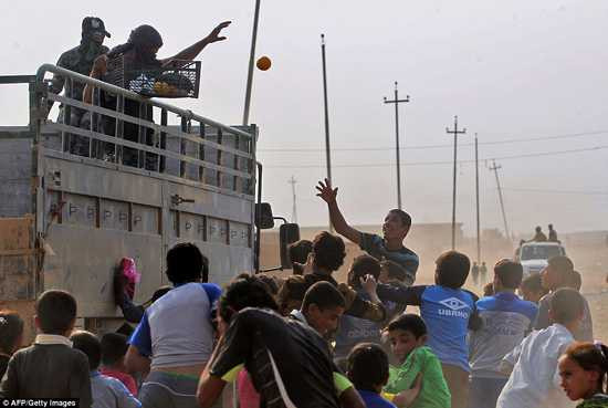 Lực lượng Iraq ném trái cây cho bọn trẻ.