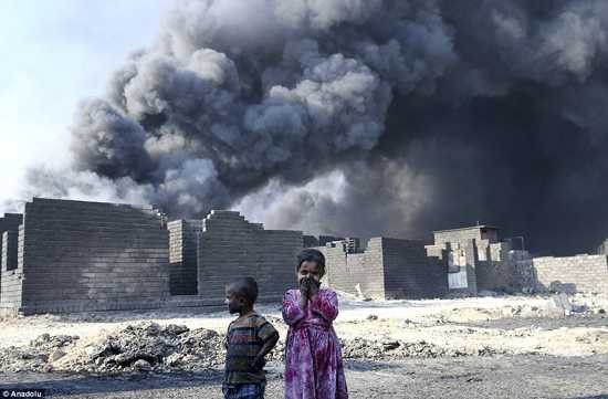 Hai đứa trẻ đứng trước khung cảnh khói bốc lên từ giếng dầu do IS phá hủy.