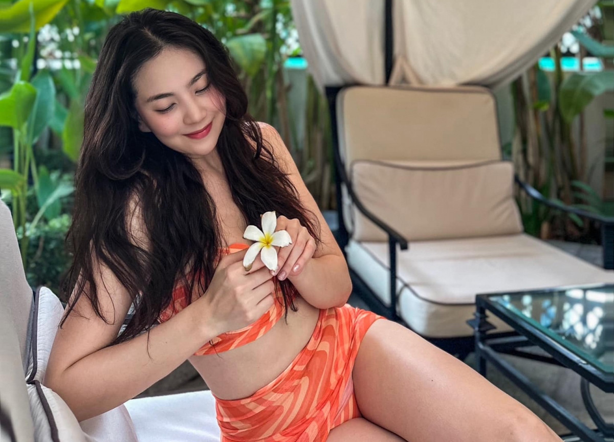 Thiết kế áo tắm giúp cô không quá hở hang, phô trương mà vẫn gợi cảm, nữ tính.