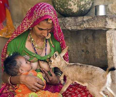 | Một phụ nữ Bishnoi cho thú rừng bú chung với con của mình |