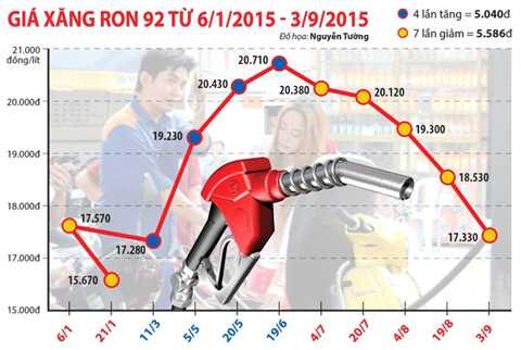 Theo tính toán của PV, từ đầu năm đến nay, giá xăng đã được điều chỉnh 11 lần. Trong đó có 7 lần giảm giá và bốn lần tăng giá với mức tăng tổng cộng 5.040 đồng/lít và giảm 5.586 đồng/lít. Như vậy, tính chung lại, mức giảm từ đầu năm đến nay chỉ hơn 500 đồng/lít.