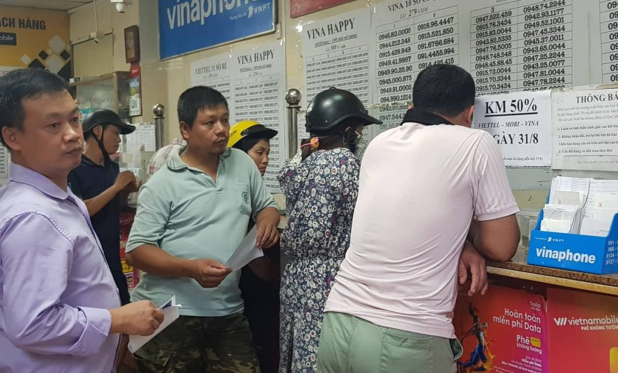 Ghi nhận của PV VTC News, ngay từ đầu giờ sáng 31/8, nhiều đại lý SIM thẻ (cấp 1) trên địa bàn Hà Nội có nhiều khách đến xếp hàng mua thẻ nạp điện thoại của 3 nhà lớn là Vinaphone - Mobifone và Viettel. Trong đó, số lượng khách hàng đến giao dịch Viettel chiếm áp đảo so với 2 nhà mạng còn lại.