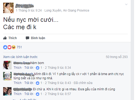 Trong số hàng trăm comment trả lời của các mẹ bỉm sữa thì một nửa trong số đó khuyên cô gái nên đi. Và lí do nên đi thì cũng phong phú vô cùng. Trong đó, phần nhiều các mẹ khuyên cô gái nên đi nếu như sau khi chia tay, hai người vẫn giữ liên lạc và mối quan hệ tạm coi là bình thường, như bạn bè. Thường thì trong tình huống này, các mẹ đến với tâm trạng thoải mái, bình tĩnh, sau khi mừng cô dâu chú rể xong thì lẳng lặng ra về.