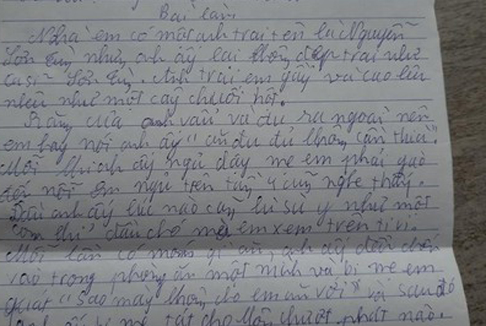 Mỗi khi có đồ gì ăn anh ấy đều trốn vào trong phòng ăn một mình và bị mẹ em quát “sao mày không cho em ăn với” và sau đó bị mẹ tát cho “không trượt phát nào”. Em rất yêu quý anh”.