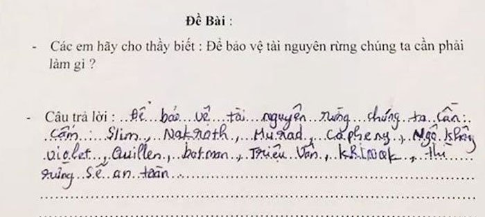 Cụ thể trong bài làm, cậu học sinh lớp 4 trả lời rằng: "Để bảo vệ tài nguyên rừng chúng ta cần cấm: Slim, Nakroth, Murad, Ngộ Không Violet, Batman, Triệu Vân,... thì rừng sẽ an toàn".