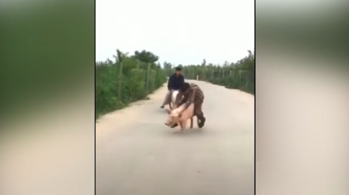 Đuổi lợn trên đường, người đàn ông chạy bở bơi tai