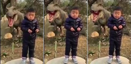 Cười té ghế clip bé trai cười méo xệch khi chụp ảnh với 'khủng long'