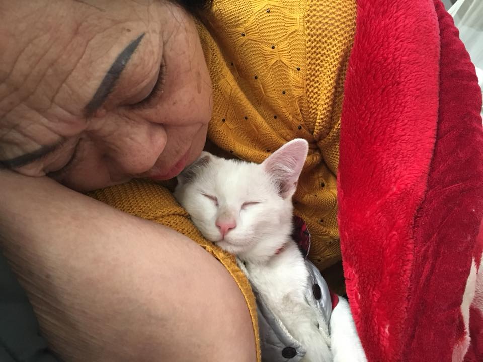 Thu Huyen: “Ông bà, bố mẹ mình cũng không cho nuôi mèo, bảo mình mang về cả nhà sẽ mang đi bán. Nhưng mình cứ vác về. Nuôi đc 1 năm thì mình đi nước ngoài, để nó ở nhà với tâm lí hoang mang lo sợ. Thì dưới đây là hình ảnh bà ngoại mình ôm nó ngủ mỗi tối. Ông ngoại thì đến bữa cơm xé thịt gà, gỡ cá cho con béo đó ăn, rồi lau mặt, lau tai cho nó. Bố mẹ thì lượn lờ mua cát, mua canin vỗ nó, rồi quần áo các kiểu. Mình mà gọi điện về toàn hôm nay cho nó ăn gì, dắt nó đi đâu. Riết rồi không biết ai là con ai là cháu.”